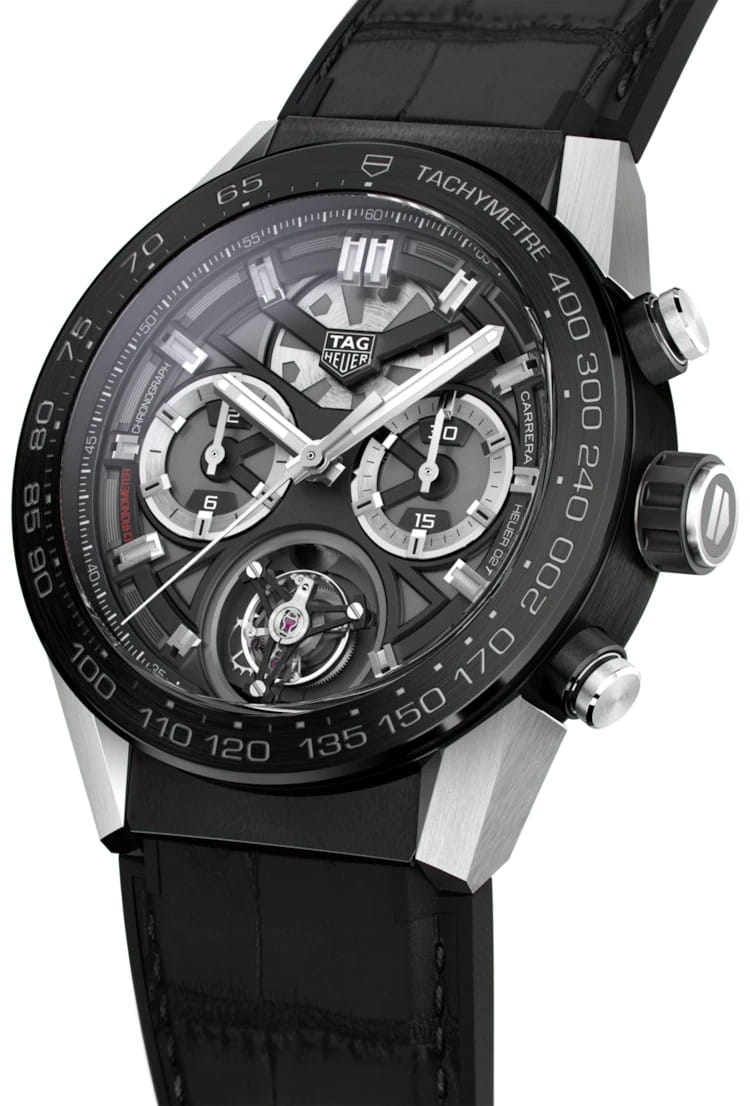 Самая продаваемая версия революционной модели TAG Heuer Carrera Heuer 02 Tourbillon с мгновенно узнаваемым скелетонизированным циферблатом и титановым корпусом. Каждый экземпляр часов подвергается интенсивным испытаниям в течение трех недель, чтобы подтвердить соответствие строгим стандартам точности хронометров, разработанными швейцарским агентством по сертификации COSC. Швейцарские мужские часы с хронографом TAG Heuer Carrera CAR5A8Y.FC6377, механический механизм (автоматический калибр) с высокой точностью. Сапфировое стекло устойчивое к появлению царапин, обладающее высокой прозрачностью. Класс водозащиты: 100 метров, позволит плавать, нырять и заниматься другими водными видами спорта. Корпус часов изготовлен из керамики, с PVD покрытием черного цвета.