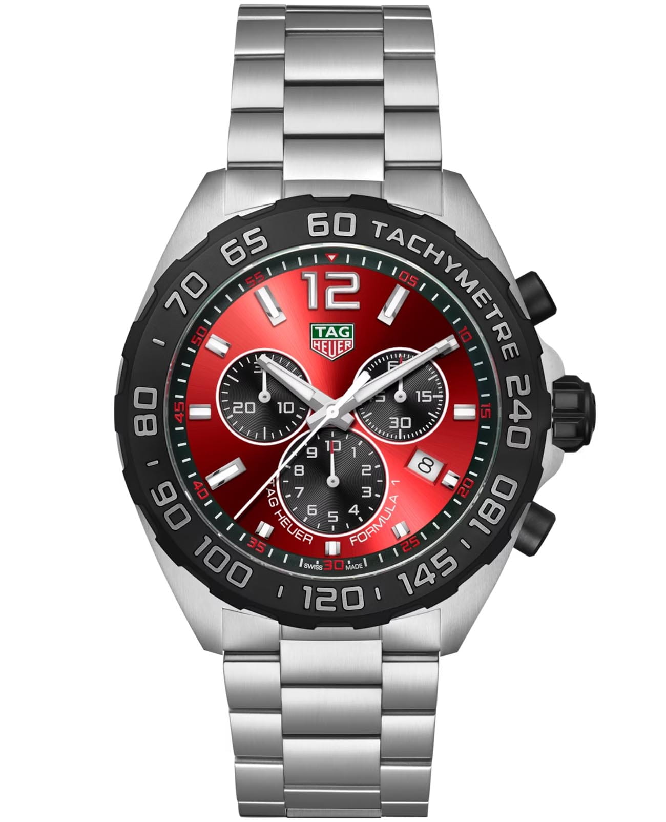 Мужские наручные часы-хронографХронографФункция позволяет измерять отрезки времени с особой точностью: часы, минуты, секунды. Верным признаком хронографа является наличие на циферблате 3 дополнительных окошек-счётчиков. TAG Heuer Formula 1 CAZ101AN.BA0842 с надёжным кварцевым механизмом. Корпус и браслет часов изготовлен из нержавеющей стали. БезельБезельВнешний ободок, закрепляющий стекло. В спортивных часах так называется поворотное кольцо с делениями на циферблате, выполняет роль таймера – замеряет отрезки времени на шкале. Неподвижный безель – элемент декора. Однонаправленно вращающийся безель на дайверских часах позволяет фиксировать моменты погружения и выныривания на поверхность. с PVD-покрытиемPVDУльтратонкое покрытие наносится в технике вакуумного напыления, сочетает в себе нитрид титана особой прочности со слоем золота или оксида хрома. Несёт в себе декоративную или защитную функцию. и шкалой тахиметраТахиметрРазмеченная шкала, располагается на ободке или безеле часов. Тахиметр позволяет рассчитать скорость на определённом участке пути, расстояние измеряется в километрах или милях.. Сапфировое стеклоСапфировое стеклоПрочный и надёжный материал из кристалла сапфира синтетического происхождения, характеризующийся особой твёрдостью и устойчивостью к царапинам и повреждениям. устойчивое к появлению царапин, обладающее высокой прозрачностью. Стрелки с люминесцентным покрытиемЛюминесцентное покрытиеПозволяет считывать показания времени в темноте. Производители наносят на стрелки, часовые индексы, безель или поверхность циферблата светонакопительный состав, дающий холодное свечение.. Класс водозащиты: 200 метров, позволит плавать, нырять и заниматься другими водными видами спорта. Стальной браслет на раскладной застёжкеРаскладная застёжкаТакой тип застёжки используется только на браслетах из металла. Она никогда не раскрывается полностью, происходит разделение на 2 и более частей. Раскладывающая застёжка снизит вероятность потери часов к минимуму.. Окошко даты находится в положении между 4 и 5 часов.