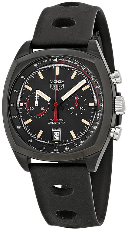 Специальная серия часов TAG Heuer Heritage Calibre 17 Monza Edition – это лимитированный выпуск, сочетающий в себе винтажный дизайн и современные технологии. Корпус из легкого и прочного титана диаметром 42 мм имеет необычную форму квадрата с выпуклыми скругленными сторонами. Ремень из черной кожи дополнен широкими круглыми отверстиями, застежка выполнена из титанового сплава.