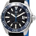 TAG Heuer Aquaracer WAY201C.FC6395 — стильные и надёжные часы, созданные для активного образа жизни и водных приключений. Корпус диаметром 43 мм выполнен из нержавеющей стали с чередующейся полированной и матовой отделкой, что придаёт модели современный и динамичный вид. Однонаправленный вращающийся безельБезельВнешний ободок, закрепляющий стекло. В спортивных часах так называется поворотное кольцо с делениями на циферблате, выполняет роль таймера – замеряет отрезки времени на шкале. Неподвижный безель – элемент декора. Однонаправленно вращающийся безель на дайверских часах позволяет фиксировать моменты погружения и выныривания на поверхность. с синей керамической вставкой оснащён минутной разметкой и светящимся маркером на позиции «12 часов», обеспечивая удобство при отсчёте времени погружения. Чёрный циферблат с вертикальным гильоше дополнен накладными часовыми индексами и стрелками с люминесцентным покрытиемЛюминесцентное покрытиеПозволяет считывать показания времени в темноте. Производители наносят на стрелки, часовые индексы, безель или поверхность циферблата светонакопительный состав, дающий холодное свечение., что гарантирует отличную читаемость в любых условиях освещения. Окошко даты с увеличительным стеклом расположено на отметке «3 часа» для удобства. Защиту циферблата обеспечивает сапфировое стеклоСапфировое стеклоПрочный и надёжный материал из кристалла сапфира синтетического происхождения, характеризующийся особой твёрдостью и устойчивостью к царапинам и повреждениям. с антибликовым покрытиемАнтибликовое покрытиеСлой оксида металла в 0,13-0,3 микрон, благодаря которому стекло часов не бликует и не отражает свет. Антибликовое покрытие уменьшает отражение света в 10 раз, обеспечивая отличную читаемость показателей циферблата.. Внутри установлен швейцарский автоматический механизм Calibre 5, обеспечивающий точность хода и запас энергии до 38 часов. Часы укомплектованы чёрным нейлоновым ремешком с кожаной подкладкой, а раскладная застёжкаРаскладная застёжкаТакой тип застёжки используется только на браслетах из металла. Она никогда не раскрывается полностью, происходит разделение на 2 и более частей. Раскладывающая застёжка снизит вероятность потери часов к минимуму. с двойной блокировкой гарантирует надёжную фиксацию на запястье. Водонепроницаемость 300 метров делает модель идеальным выбором для занятий водными видами спорта, включая дайвинг.