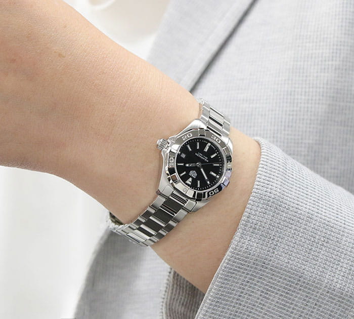 Изысканные кварцевые женские часы TAG Heuer Aquaracer WBD1410.BA0741 с большим, выразительным корпусом диаметром 27 мм из нержавеющей стали. Кварцевый механизм с высокой точностью. Сапфировое стеклоСапфировое стеклоПрочный и надёжный материал из кристалла сапфира синтетического происхождения, характеризующийся особой твёрдостью и устойчивостью к царапинам и повреждениям. устойчивое к появлению царапин, обладающее высокой прозрачностью. Класс водозащиты: 300 метров, позволит плавать, нырять и заниматься другими водными видами спорта. Корпус часов изготовлен из стали, серебристого цвета. Стрелки с люминесцентным покрытиемЛюминесцентное покрытиеПозволяет считывать показания времени в темноте. Производители наносят на стрелки, часовые индексы, безель или поверхность циферблата светонакопительный состав, дающий холодное свечение.. Стальной браслет на раскладной застёжкеРаскладная застёжкаТакой тип застёжки используется только на браслетах из металла. Она никогда не раскрывается полностью, происходит разделение на 2 и более частей. Раскладывающая застёжка снизит вероятность потери часов к минимуму..