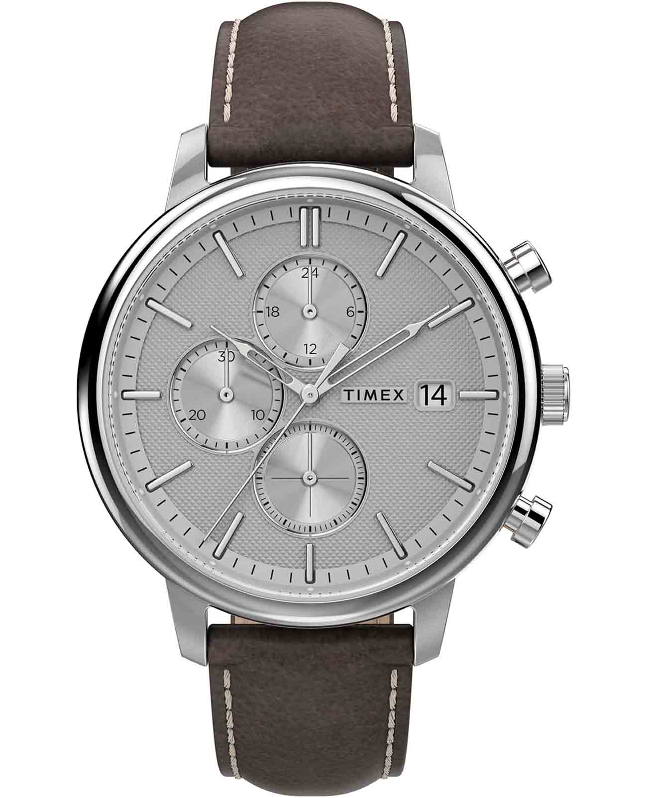 Наручные часы Timex TW2U38800 — стильный и функциональный аксессуар, который станет отличным дополнением к вашему повседневному образу. Эти часы произведены в США и оснащены надежным кварцевым механизмом, что обеспечивает их точность и долговечность. Корпус часов выполнен из нержавеющей стали, придающим изделию элегантный вид и прочности. Серебристый циферблат украшен метками в виде штрихов и дополнен окошком даты для удобного отображения числа. Часы также оснащены секундомеромСекундомерСекундоме́р — прибор, способный измерять интервалы времени с точностью до долей секунды. и функцией хронографаХронографФункция позволяет измерять отрезки времени с особой точностью: часы, минуты, секунды. Верным признаком хронографа является наличие на циферблате 3 дополнительных окошек-счётчиков., что делает их функциональными для повседневного использования. Часы имеют рифленую заводную головку и защищены минеральным стекломМинеральное стеклоМинеральное стекло представляет собой искусственно выращенный минерал кварца. Такое стекло отличается особой устойчивостью к повреждениям и царапинам. Уступает по некоторым качествам сапфировому стеклу., устойчивым к царапинам. Стальная задняя крышка обеспечивает дополнительную защиту механизма. Кожаный ремешок с классической застежкой и системой быстрой замены позволяет легко адаптировать аксессуар под ваш стиль. Водозащита на уровне 50WR защищает часы от воздействия воды, что делает их подходящими для повседневного ношения, включая случайные контакты с водой. Диаметр корпуса составляет 45 мм, а ширина ремешка — 20 мм, что обеспечивает комфортное ношение на запястье.