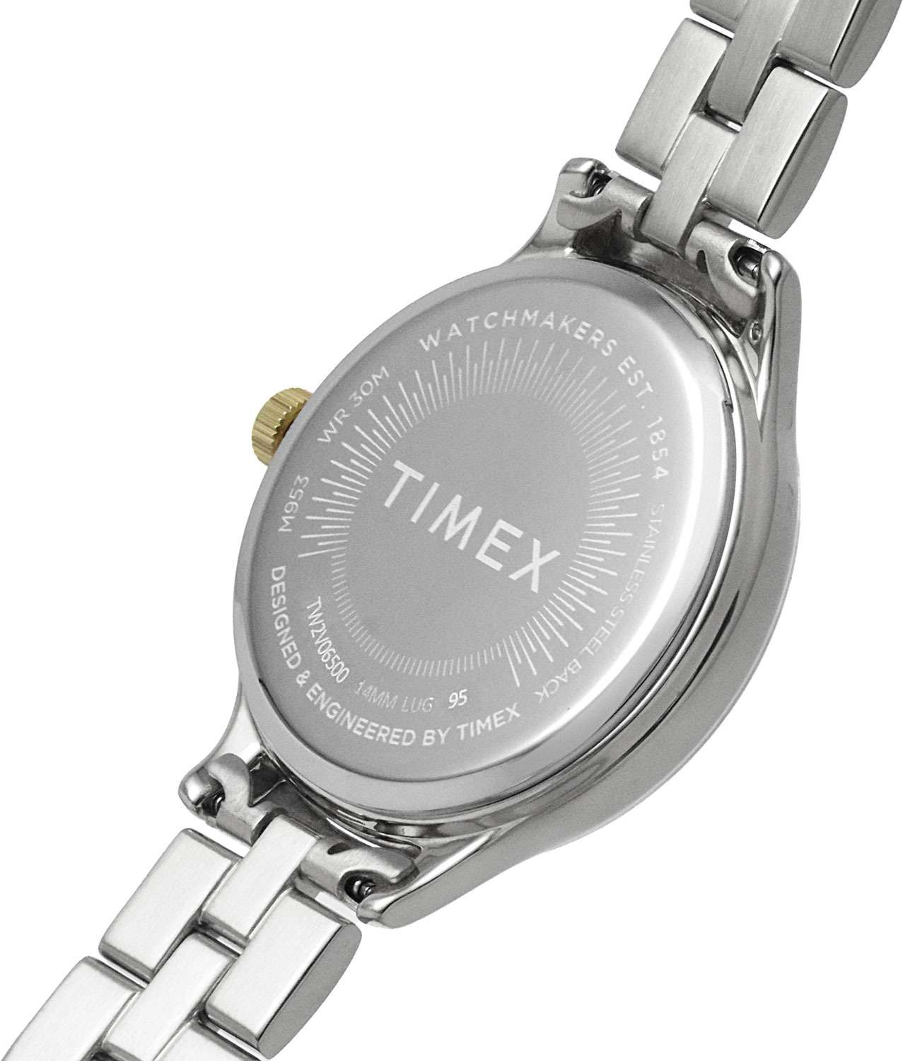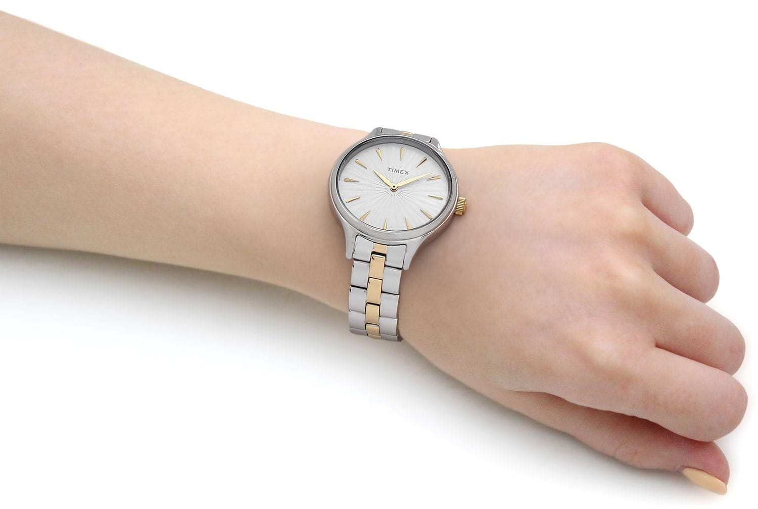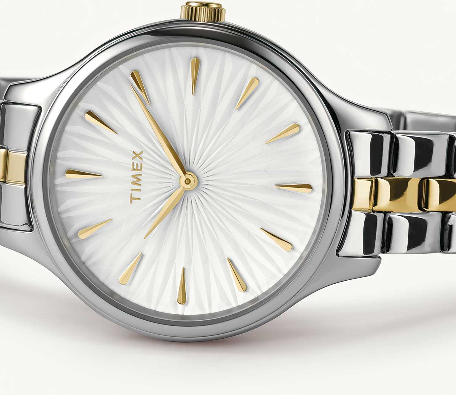 Наручные часы Timex TW2V06500 — это изящный аксессуар, который подчеркнет превосходный вкус своей обладательницы. Изготовленные в США, эти практичные женские часы оснащены надежным кварцевым механизмом, обеспечивающим точность хода. Корпус часов выполнен из латуни, которое придает изделию изысканный и современный вид. Белый циферблат украшен рельефным декоративным узором и оснащен листовидными стрелками в стиле Feuille, что обеспечивает элегантный внешний вид. Метки в виде штрихов и отсутствие секундной стрелки придают модели минималистичный стиль. Часы оснащены рифленой заводной головкой и надежным стальным браслетом с частичным PVDPVDУльтратонкое покрытие наносится в технике вакуумного напыления, сочетает в себе нитрид титана особой прочности со слоем золота или оксида хрома. Несёт в себе декоративную или защитную функцию. покрытием, который имеет раскладную застёжкуРаскладная застёжкаТакой тип застёжки используется только на браслетах из металла. Она никогда не раскрывается полностью, происходит разделение на 2 и более частей. Раскладывающая застёжка снизит вероятность потери часов к минимуму. для комфортной посадки на запястье. Водозащита 30WR позволяет носить часы в различных условиях, защищая их от случайных брызг. Минеральное стеклоМинеральное стеклоМинеральное стекло представляет собой искусственно выращенный минерал кварца. Такое стекло отличается особой устойчивостью к повреждениям и царапинам. Уступает по некоторым качествам сапфировому стеклу. защищает циферблат от царапин и повреждений, сохраняя его первозданный вид. Размеры корпуса составляют 36 мм в диаметре, а ширина браслета — 14 мм, что делает часы элегантными и подходящими для любого случая.