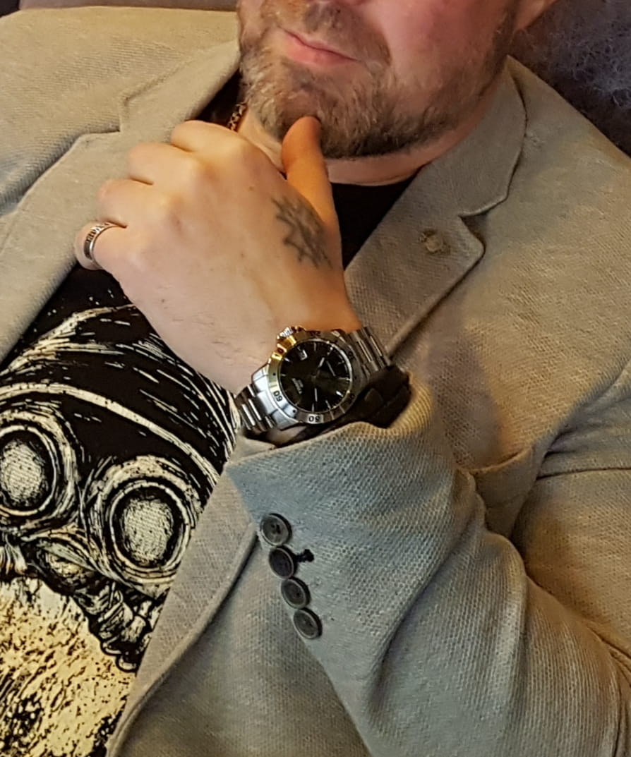 Наручные часы сделаны из нержавеющей стали 316L, долговечный материал отличается устойчивостью к царапинам. Их лаконичное исполнение и фактурный чёрный циферблат позволяет сочетать аксессуар с любой одеждой. Модель оснащена автоматическим калибром ETA SwissmaticSwissmaticШвейцарский автоматический калибр от компании ETA с 3-х дневным запасом хода и 19 камнями в механизме (C15.111), отличается высокой точностью хода., сохраняющим запас хода на 72 часа. Прозрачная задняя крышка корпуса. Стекло из сапфира. Яркая люминесцентная подсветкаЛюминесцентное покрытиеПозволяет считывать показания времени в темноте. Производители наносят на стрелки, часовые индексы, безель или поверхность циферблата светонакопительный состав, дающий холодное свечение.. Водостойкость до 10 бар. . Апертура даты. Габариты: 42,5 x 42,5 x 12,7 мм.