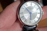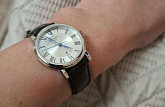 Модель выполнена в классическом стиле, тонкий ремешок из натуральной кожи стал идеальным вариантом для компактного белого циферблата. Оригинально смотрятся синие удлинённые стрелки. Часы оснащены кварцевым механизмом ETA F03.115, позволяющим измерять время с особой точностью. Прочное стекло из сапфира. Водонепроницаемость 50 метров. Отображение даты, индикатор EOLEOLПредставляет собой систему, уведомляющую владельца часов о необходимости замены элемента питания. За 2 недели до полного разряда батарейки секундная стрелка перестаёт ходить чётко и начинает перепрыгивать на 3-4 деления.. Габариты: 30 x 30 x 6,7 мм.