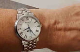 Прочное сапфировое стекло . Водонепроницаемость 50 метров. Индикация фазы луны на отдельном циферблате около шестичасовой отметки. Браслет из нержавеющей стали с тройной застежкой-бабочкой.