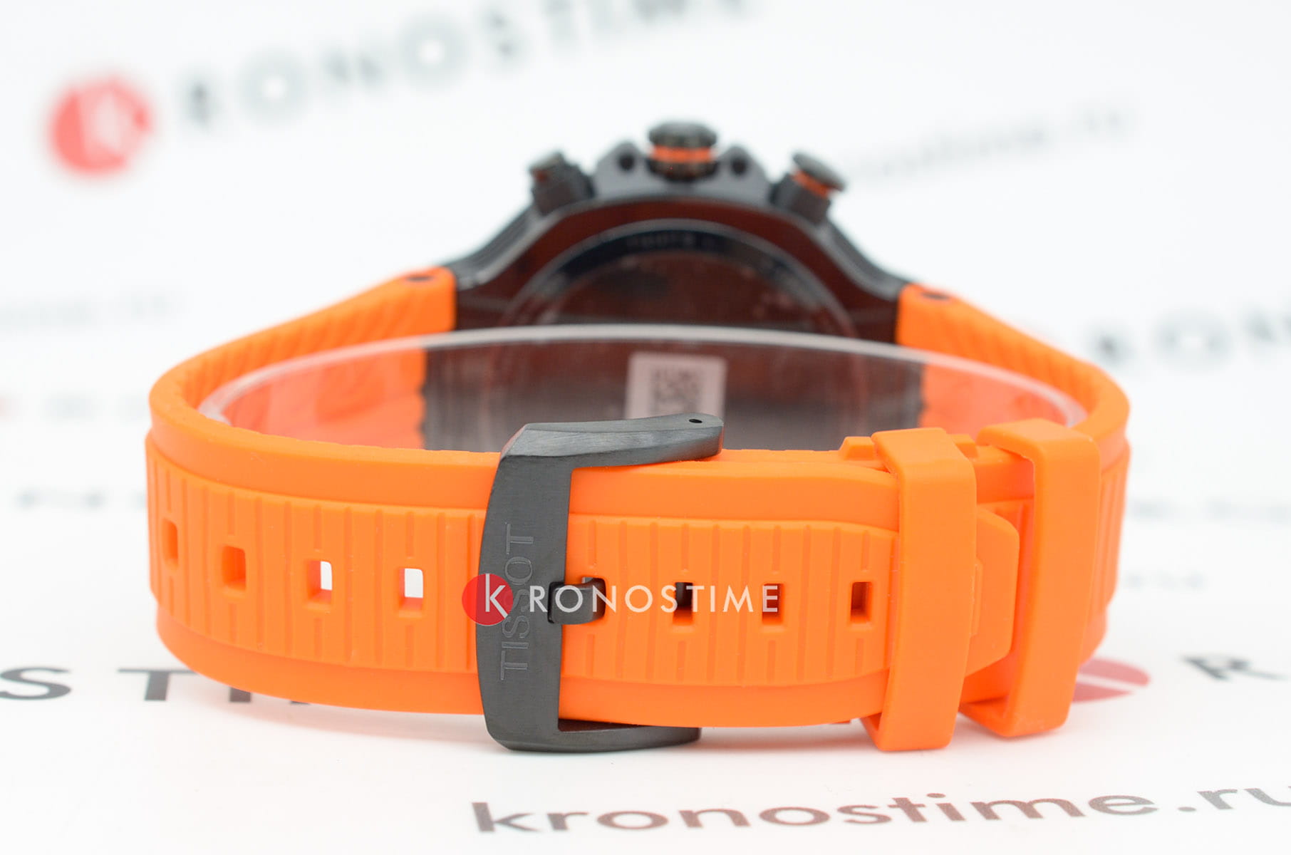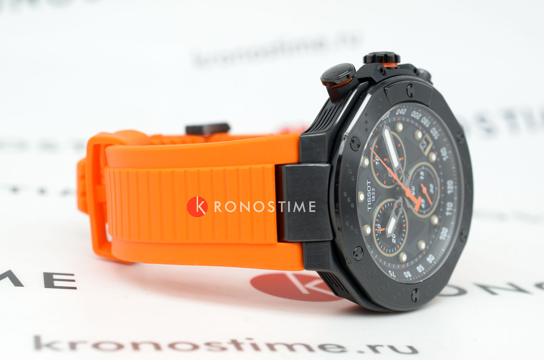 Tissot T-Race MotoGP Quartz Chronograph T141.417.37.051.02 – серия мужских часов, посвященная сотрудничеству Tissot с чемпионатом MotoGP™. Корпус диаметром 45 мм выполнен из нержавеющей стали 316L и корпус с PVD-покрытиемPVDУльтратонкое покрытие наносится в технике вакуумного напыления, сочетает в себе нитрид титана особой прочности со слоем золота или оксида хрома. Несёт в себе декоративную или защитную функцию. в чёрном цвете, придающим часам современный и спортивный вид. Глубокий циферблат защищён сапфировым стекломСапфировое стеклоПрочный и надёжный материал из кристалла сапфира синтетического происхождения, характеризующийся особой твёрдостью и устойчивостью к царапинам и повреждениям. с антибликовым покрытиемАнтибликовое покрытиеСлой оксида металла в 0,13-0,3 микрон, благодаря которому стекло часов не бликует и не отражает свет. Антибликовое покрытие уменьшает отражение света в 10 раз, обеспечивая отличную читаемость показателей циферблата., обеспечивающим устойчивость к царапинам и отличную читаемость в любых условиях. Задняя крышка корпуса украшена гравировкой, подчеркивающей уникальность модели. Часы оснащены швейцарским кварцевым механизмом, обеспечивающим высокую точность хода. Функциональность модели включает хронографХронографФункция позволяет измерять отрезки времени с особой точностью: часы, минуты, секунды. Верным признаком хронографа является наличие на циферблате 3 дополнительных окошек-счётчиков. с центральной секундной стрелкой, 30-минутным и 1/10-секундным счетчиками, а также функциями ADD и сплит-хронографаСплит-хронографИспользуется для измерения продолжительности нескольких временных отрезков, начинающихся одновременно, а заканчивающихся в разное время.. Индексы и стрелки покрыты люминесцентным покрытиемЛюминесцентное покрытиеПозволяет считывать показания времени в темноте. Производители наносят на стрелки, часовые индексы, безель или поверхность циферблата светонакопительный состав, дающий холодное свечение. Super-LumiNova®, обеспечивающим отличную видимость в темное время суток. Силиконовый ремешок с классической застёжкой обеспечивает комфортное ношение и надёжную фиксацию на запястье. Водозащита до 100 метров (10 бар) позволяет использовать часы во время плавания и других водных видов спорта. Эта модель идеально подходит для поклонников MotoGP™ и ценителей высококачественных швейцарских часов с уникальным дизайном и расширенной функциональностью.