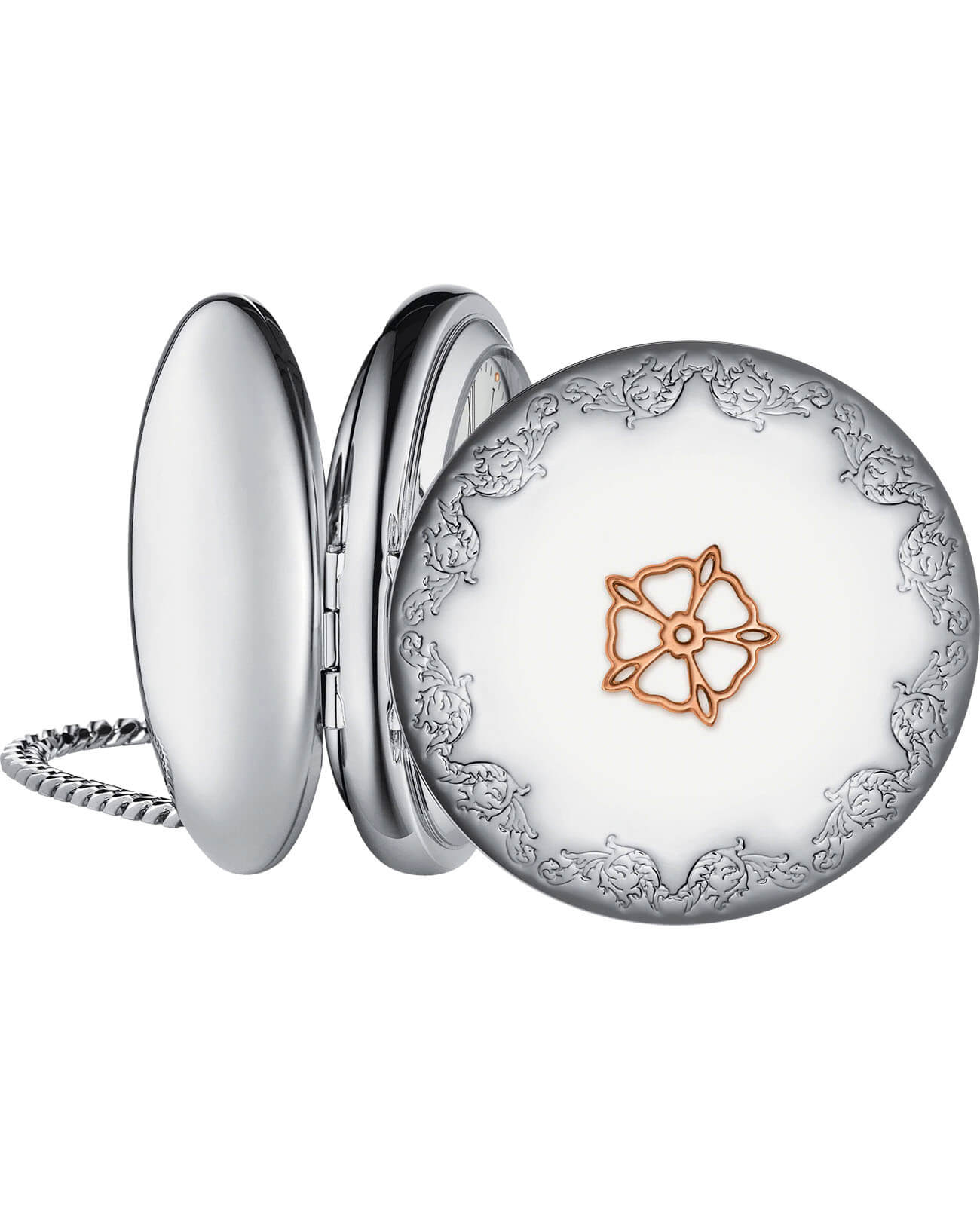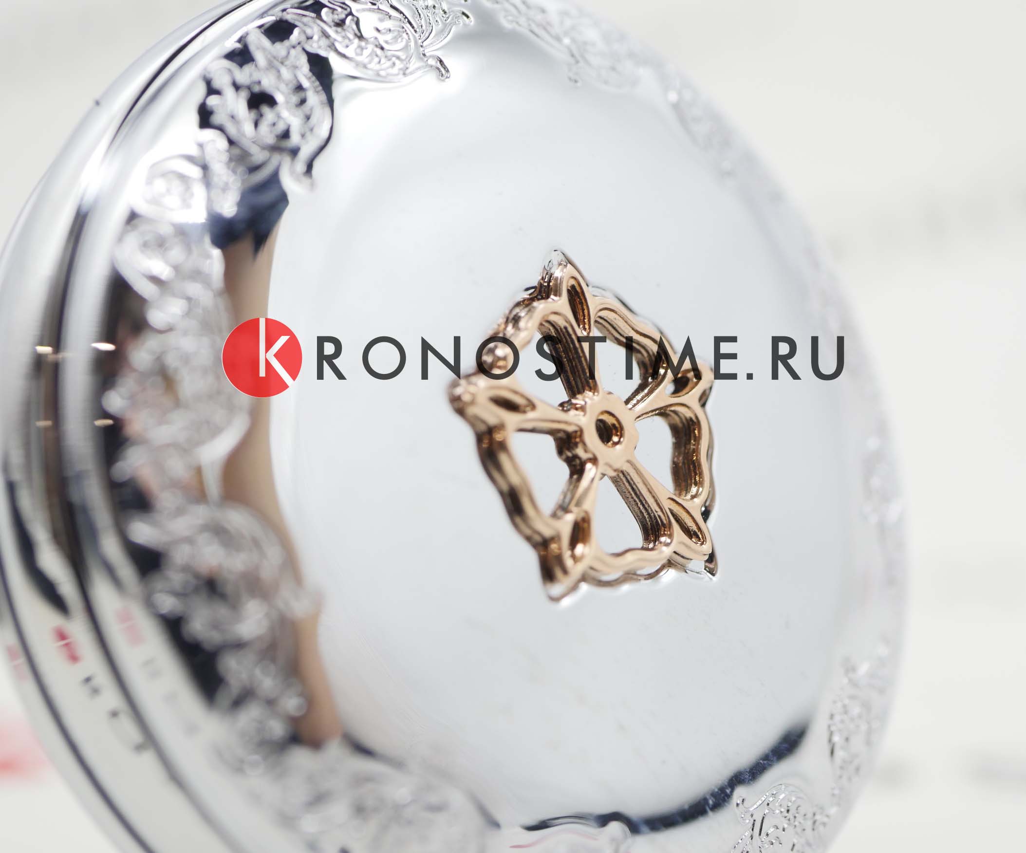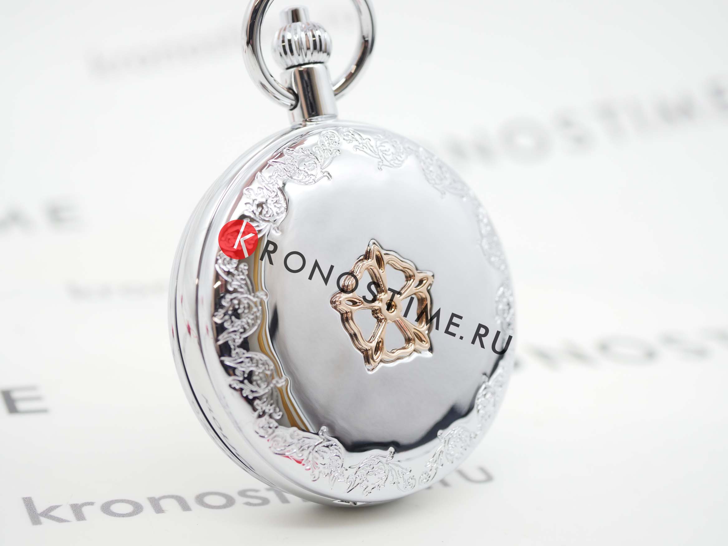 Модель имеет лёгкий ностальгический оттенок, крышка дополнена узнаваемым логотипом. Серебристый циферблат дополнен римскими цифрами, привлекательно смотрятся акценты цвета розового золота. Контрастные ажурные стрелки – отдельное произведение искусства. Это механические часы с ручным заводом, что необходимо делать регулярно. Они оснащены швейцарским пружинным механизмом ETA 6498-1, запас хода рассчитан на 46 часов. Калибр скрывается внутри корпуса из гипоаллергенной латуни с палладиевым покрытием. Используется 2 вида стекла – минеральное и хезалитовое. Часы поставляются в комплекте с цепочкой. Диаметр корпуса: 49,8 мм.