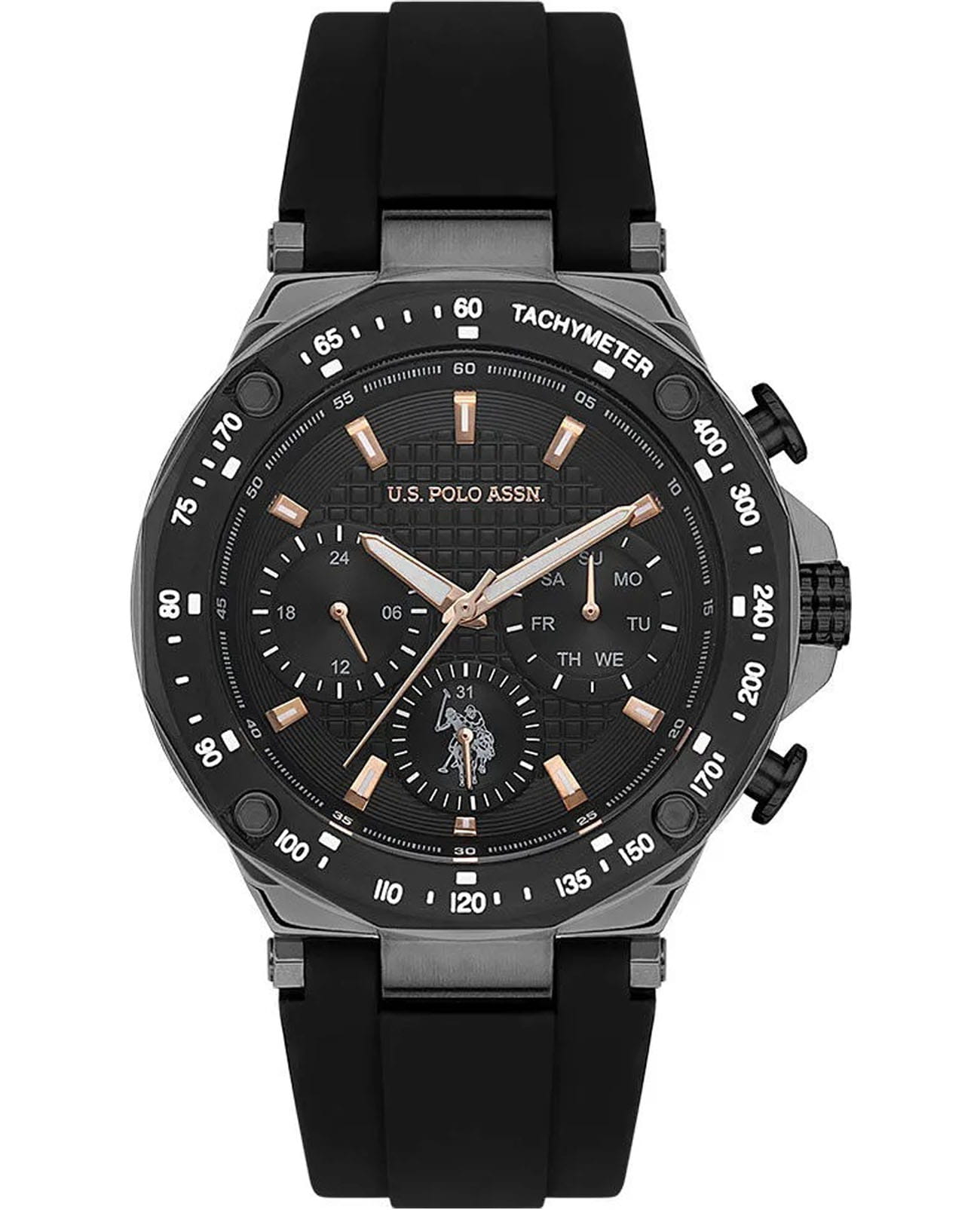 Мужские элегантные американские часы U.S. Polo Assn. Crossing USPA1076-01 обладают кварцевым механизмом с высокой точностью. Минеральное стеклоМинеральное стеклоМинеральное стекло представляет собой искусственно выращенный минерал кварца. Такое стекло отличается особой устойчивостью к повреждениям и царапинам. Уступает по некоторым качествам сапфировому стеклу. устойчивое к появлению царапин, обладающее высокой прозрачностью. Изысканный корпус изготовлен из нержавеющей стали с PVD-покрытиемPVDУльтратонкое покрытие наносится в технике вакуумного напыления, сочетает в себе нитрид титана особой прочности со слоем золота или оксида хрома. Несёт в себе декоративную или защитную функцию. с безелемБезельВнешний ободок, закрепляющий стекло. В спортивных часах так называется поворотное кольцо с делениями на циферблате, выполняет роль таймера – замеряет отрезки времени на шкале. Неподвижный безель – элемент декора. Однонаправленно вращающийся безель на дайверских часах позволяет фиксировать моменты погружения и выныривания на поверхность.. Лаконичные центральные часовая, минутная и секундная стрелки. 24-х часовой формат времени, окошко даты и дня недели вынесены на отдельный циферблат. Часы оснащены люминесцентным покрытиемЛюминесцентное покрытиеПозволяет считывать показания времени в темноте. Производители наносят на стрелки, часовые индексы, безель или поверхность циферблата светонакопительный состав, дающий холодное свечение., обеспечивающим хорошую читаемость в темноте. Класс водозащиты: 50 метров, позволит защитить корпус от случайных брызг или капель дождя. Силиконовый ремень со стандартной застежкой обеспечивает комфорт и удобство в использовании, добавляя завершающий штрих к этому стильному и высокоэффективному аксессуару. Часы с тахиметромТахиметрРазмеченная шкала, располагается на ободке или безеле часов. Тахиметр позволяет рассчитать скорость на определённом участке пути, расстояние измеряется в километрах или милях.. Это практичный и стильный инструмент для активной повседневности, объединяющий точный механизм и удобство.