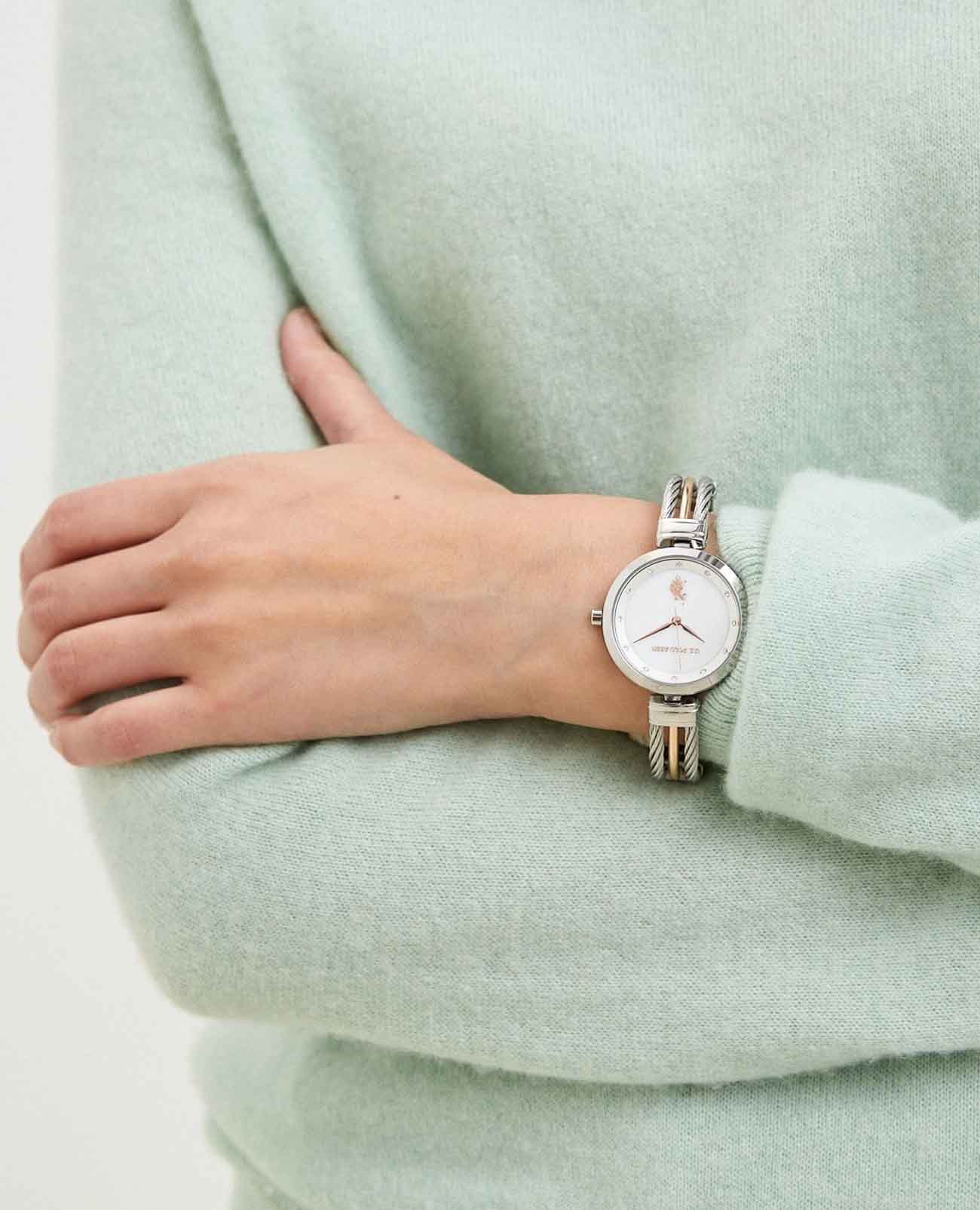 Женские часы U.S. Polo Assn Stile USPA2029-04, кварцевый механизм с высокой точностью. Минеральное стеклоМинеральное стеклоМинеральное стекло представляет собой искусственно выращенный минерал кварца. Такое стекло отличается особой устойчивостью к повреждениям и царапинам. Уступает по некоторым качествам сапфировому стеклу. устойчивое к появлению царапин, обладающее высокой прозрачностью. Корпус изготовлен из нержавеющей стали. Циферблат украшен кристаллами. Класс водозащиты: 50 метров, позволит защитить корпус от случайных брызг или капель дождя. Стальной браслет с частичным IP-покрытиемIP-покрытиеМетод ионного напыления. Демонстрирует повышенную устойчивость к истиранию, окислению и химическим веществам. Под воздействием высокого давления и температуры около 1500°C молекулы металла надёжно соединяются с частицами корпуса часов. на ювелирной застёжке.