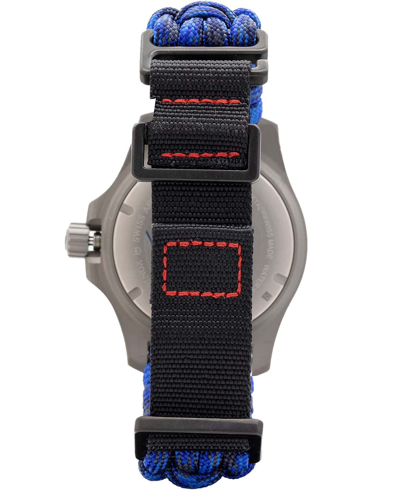 Мужские швейцарские часы Victorinox I.N.O.X. 241813. Сапфировое стеклоСапфировое стеклоПрочный и надёжный материал из кристалла сапфира синтетического происхождения, характеризующийся особой твёрдостью и устойчивостью к царапинам и повреждениям. с трёхслойным антибликовым покрытием. Корпус часов выполнен из нержавеющей стали 316L. Ремешок изготовлен из плетенной паракордовой стропы, длиной 2,5 метра и способной выдержать 250 кг. Влагозащита: 200 метров, позволит плавать, нырять и заниматься другими водными видами спорта. Окошко даты находится в положении между 4 и 5 часов. Стрелки и метки с люминесцентным покрытиемЛюминесцентное покрытиеПозволяет считывать показания времени в темноте. Производители наносят на стрелки, часовые индексы, безель или поверхность циферблата светонакопительный состав, дающий холодное свечение..