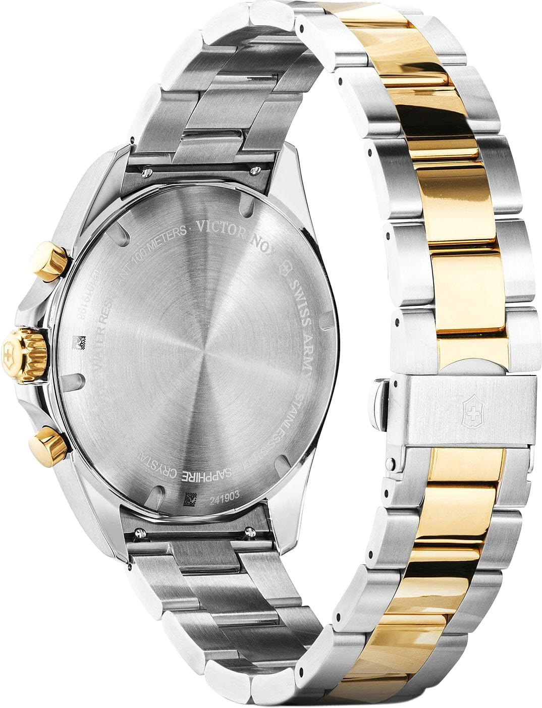Мужские швейцарские часы-хронографХронографФункция позволяет измерять отрезки времени с особой точностью: часы, минуты, секунды. Верным признаком хронографа является наличие на циферблате 3 дополнительных окошек-счётчиков. Victorinox Fieldforce Chronograph 241903 с надёжным кварцевым механизмом. Сапфировое стеклоСапфировое стеклоПрочный и надёжный материал из кристалла сапфира синтетического происхождения, характеризующийся особой твёрдостью и устойчивостью к царапинам и повреждениям. с трёхслойным антибликовым покрытием. Корпус часов выполнен из нержавеющей стали 316L. Стальной браслет с частичным PVD-покрытиемPVDУльтратонкое покрытие наносится в технике вакуумного напыления, сочетает в себе нитрид титана особой прочности со слоем золота или оксида хрома. Несёт в себе декоративную или защитную функцию. на раскладной застёжкеРаскладная застёжкаТакой тип застёжки используется только на браслетах из металла. Она никогда не раскрывается полностью, происходит разделение на 2 и более частей. Раскладывающая застёжка снизит вероятность потери часов к минимуму.. Влагозащита: 100 метров, позволит плавать, нырять и заниматься другими водными видами спорта. Окошко даты находится в положении 6 часов, стрелки и метки с люминесцентным покрытиемЛюминесцентное покрытиеПозволяет считывать показания времени в темноте. Производители наносят на стрелки, часовые индексы, безель или поверхность циферблата светонакопительный состав, дающий холодное свечение., тахиметрТахиметрРазмеченная шкала, располагается на ободке или безеле часов. Тахиметр позволяет рассчитать скорость на определённом участке пути, расстояние измеряется в километрах или милях..