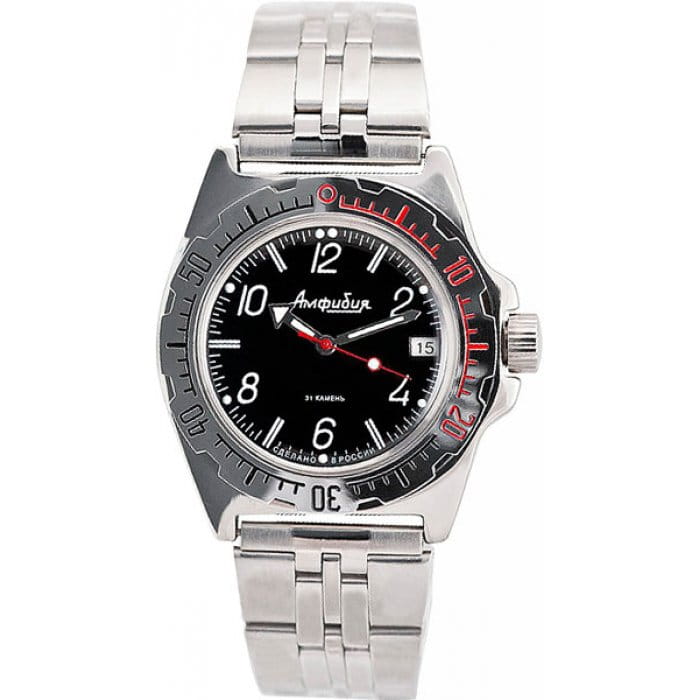Эти практичные часы великолепно сидят на руке и позволят вам чувствовать себя уверенно в любой обстановке. Амфибия Классика. В механизме 31 камень, частота 19800 полуколебаний в час. Запас хода 31 час. Противоударное устройство оси баланса. Браслет с раскладывающейся застежкой.