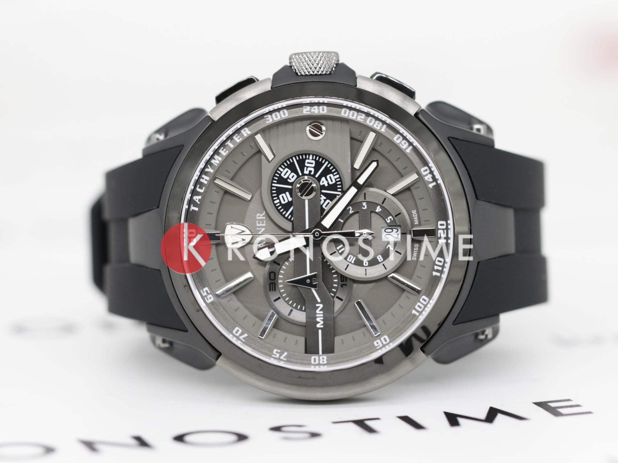Функциональность дополняется хронографомХронографФункция позволяет измерять отрезки времени с особой точностью: часы, минуты, секунды. Верным признаком хронографа является наличие на циферблате 3 дополнительных окошек-счётчиков. для точного измерения времени, тахиметрической шкалойТахиметрРазмеченная шкала, располагается на ободке или безеле часов. Тахиметр позволяет рассчитать скорость на определённом участке пути, расстояние измеряется в километрах или милях. и индикатором даты.